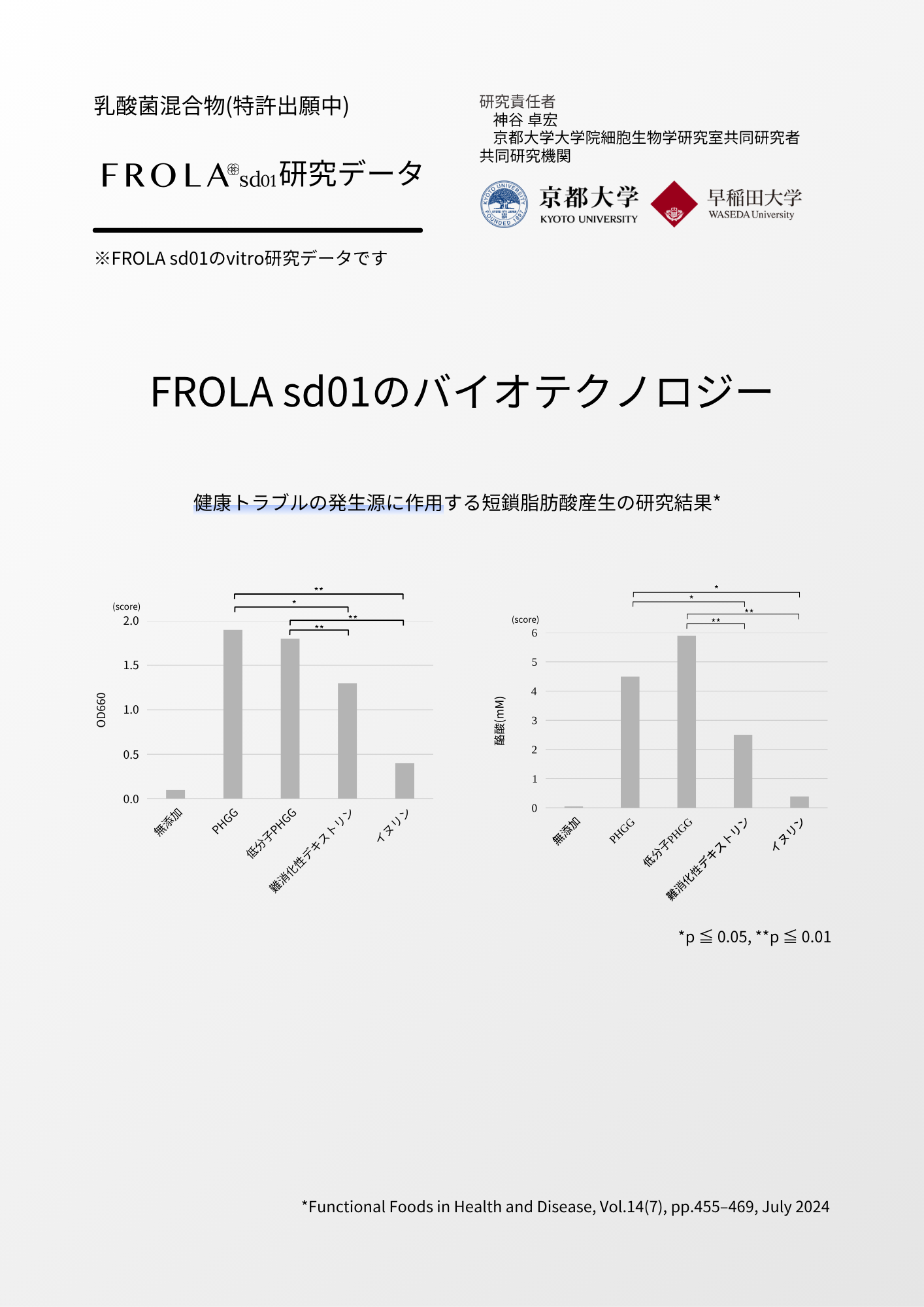 バイオテクノロジーにより開発されたFROLA sd01が腸内細菌のエサとなり、健康トラブルの“発生源”にアプローチする短鎖脂肪酸を産生することで、各種の健康をサポートします。 【成分表】