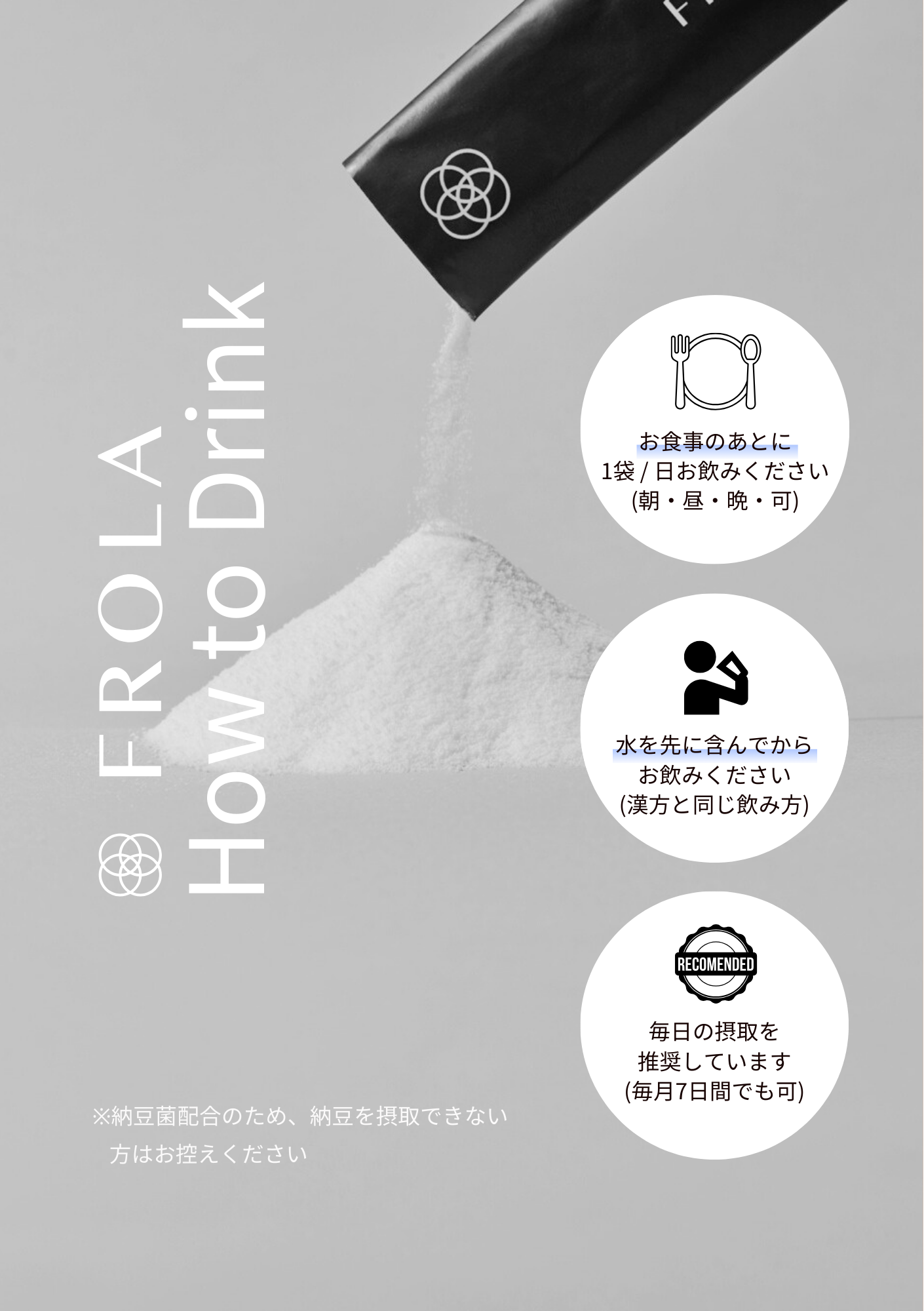 ・原材料名 : グァーガム分解物(インド製造)、酪酸菌末、納豆菌末、乳酸菌末(一部に乳成分・大豆を含む)